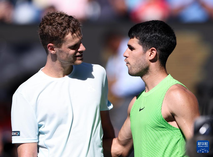 1月21日,西班牙选手阿尔卡拉斯(右)与德国选手汉夫曼赛后致意。