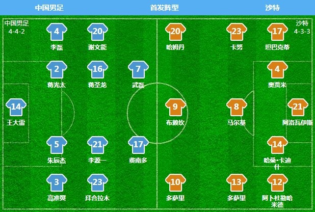 上届12强赛,国足两次面对沙特时均采用了五后卫阵型,客场1球小负,“主场”战平对手,总体表现达到了外界预期。经历了埼玉之战的惨败,伊万科维奇没有打算在压力下屈服。国足在赛前训练中演练了442和433(451)两种阵型,五后卫阵型依然只是备选方案,伊万科维奇希望通过部分位置的人员调整来弥补漏洞,启用高准翼和李磊是为了应对伤病的被动变招,拜合拉木和费南多获得重用才是战术变轨的信号。